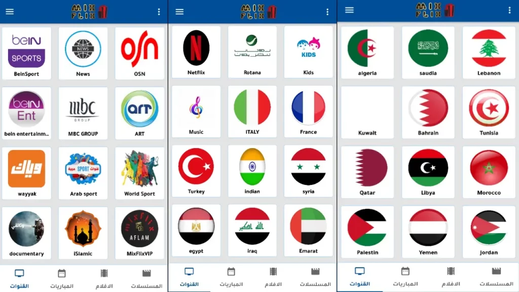 تطبيق ميكس فليكس يضم العديد من الباقات العالمية لمشاهدة الدوريات ولمباريات كاس العالم ، حيث إيضا انه افضل تطبيق لمشاهدة بث مباشر في وقتنا الحالي.