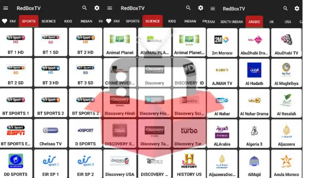 - يصنف redbox tv القنوات التلفزيونية الى اكثر من 20 فئة منها الأخبار و الرياضة و العلوم و الاطفال و الدين والبرامج التلفيزيونيه و الأفلام وفئات منفصلة لعرض والقنوات المشفرة.